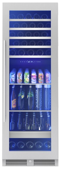 Keep wine, beer, soda, juice and more on hand and ready to drink in this Full Size Wine & Beverage Cooler. Featuring Full-Extension Wood Racks for bottle storage, a stainless steel Full-Extension Rollout Bin for easy access, vertical LED light strips in three colors and four light levels.Read More